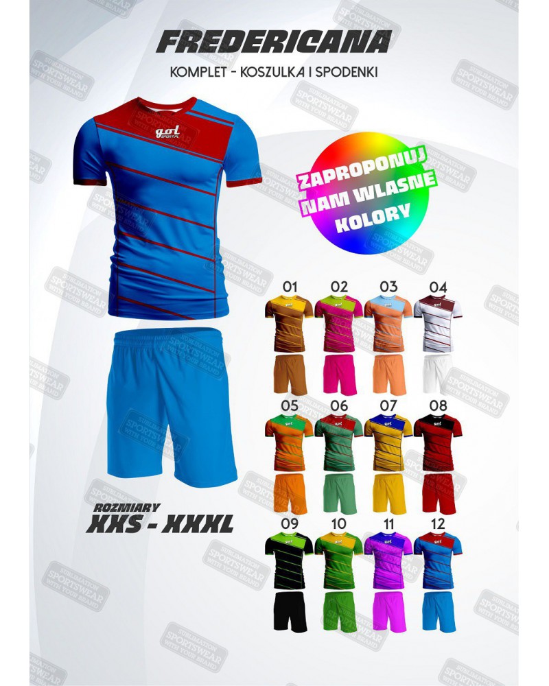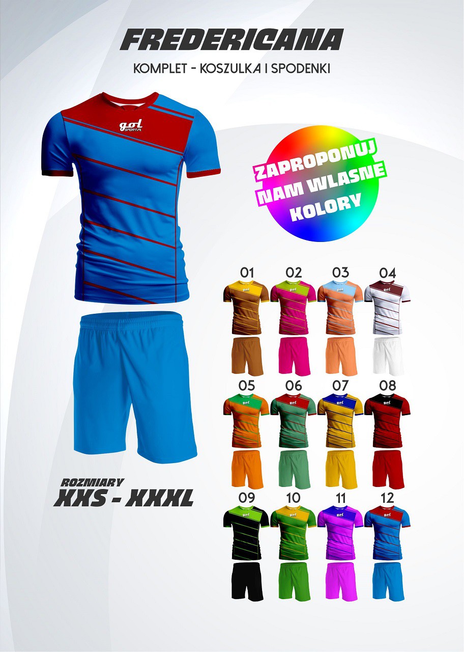 Komplet sportowy wykonany z dzianiny poliestrowej mikro o gramaturze 130g bardzo wytrzymałej, komfortowej i dobrze oddającej wilgoć. Komplet składa się z koszulki oraz spodenek. Komplet w przedstawionym wzorze graficznym z małym logo Golsport.pl, wykonywany na zamówienie.