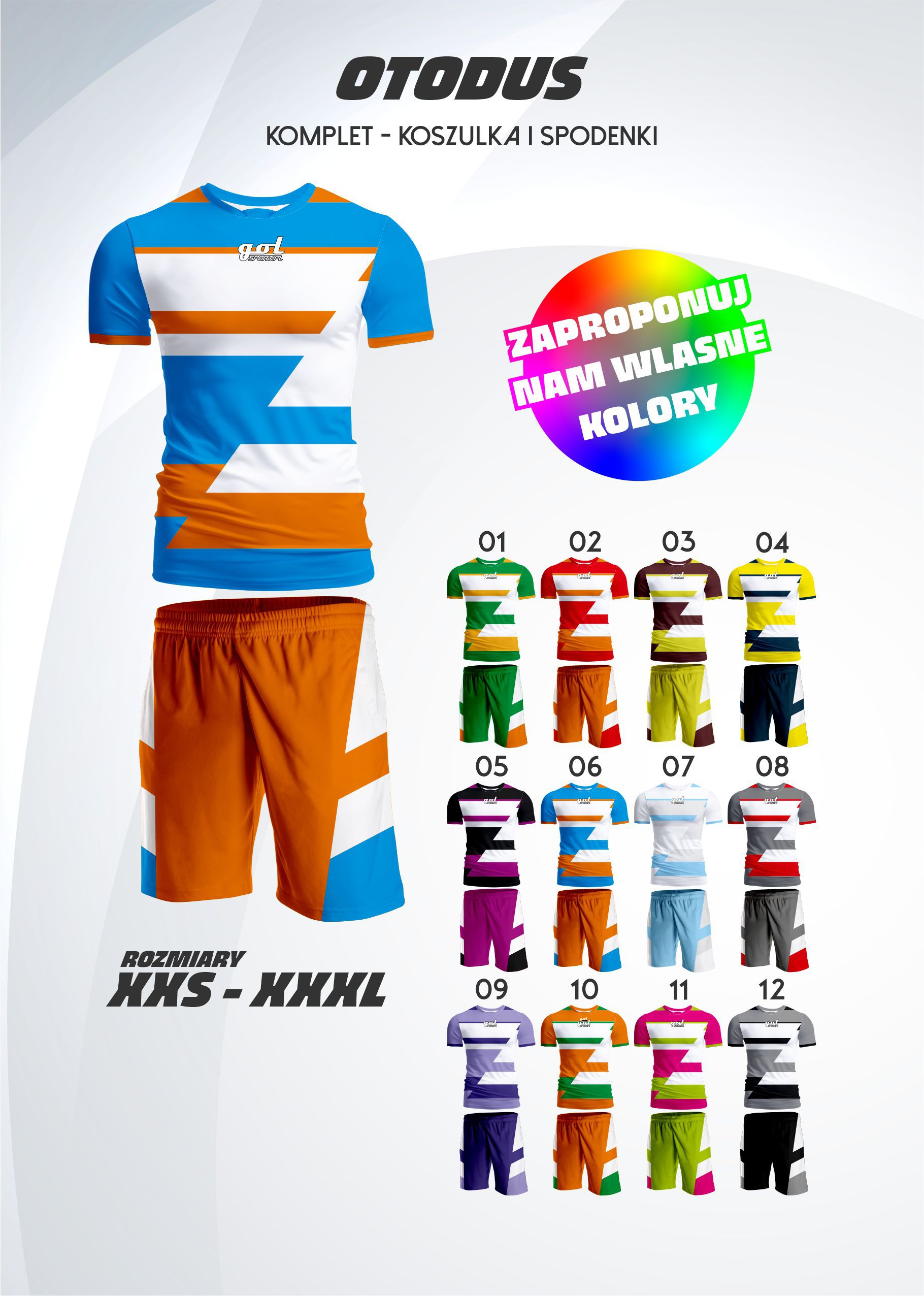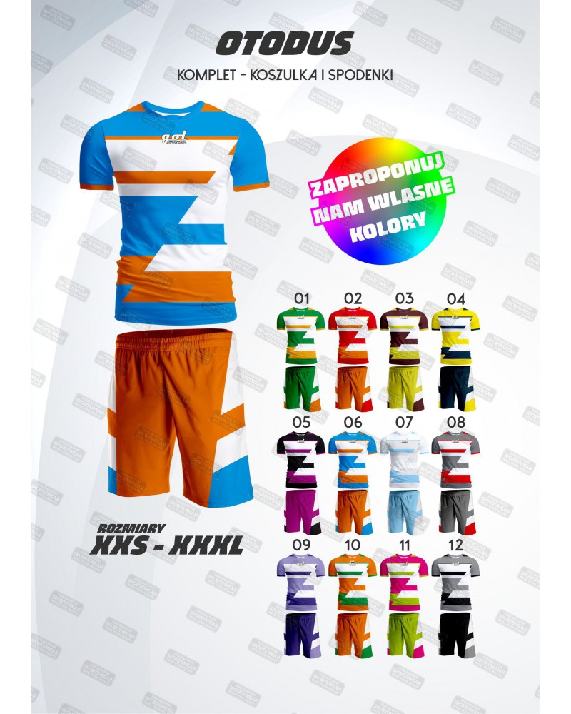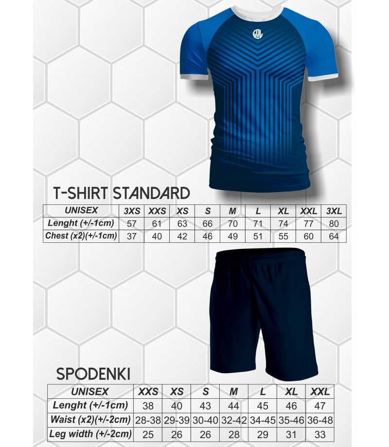 Komplet sportowy wykonany z dzianiny poliestrowej mikro o gramaturze 130g bardzo wytrzymałej, komfortowej i dobrze oddającej wilgoć. Komplet składa się z koszulki oraz spodenek. Komplet w przedstawionym wzorze graficznym z małym logo Golsport.pl, wykonywany na zamówienie.