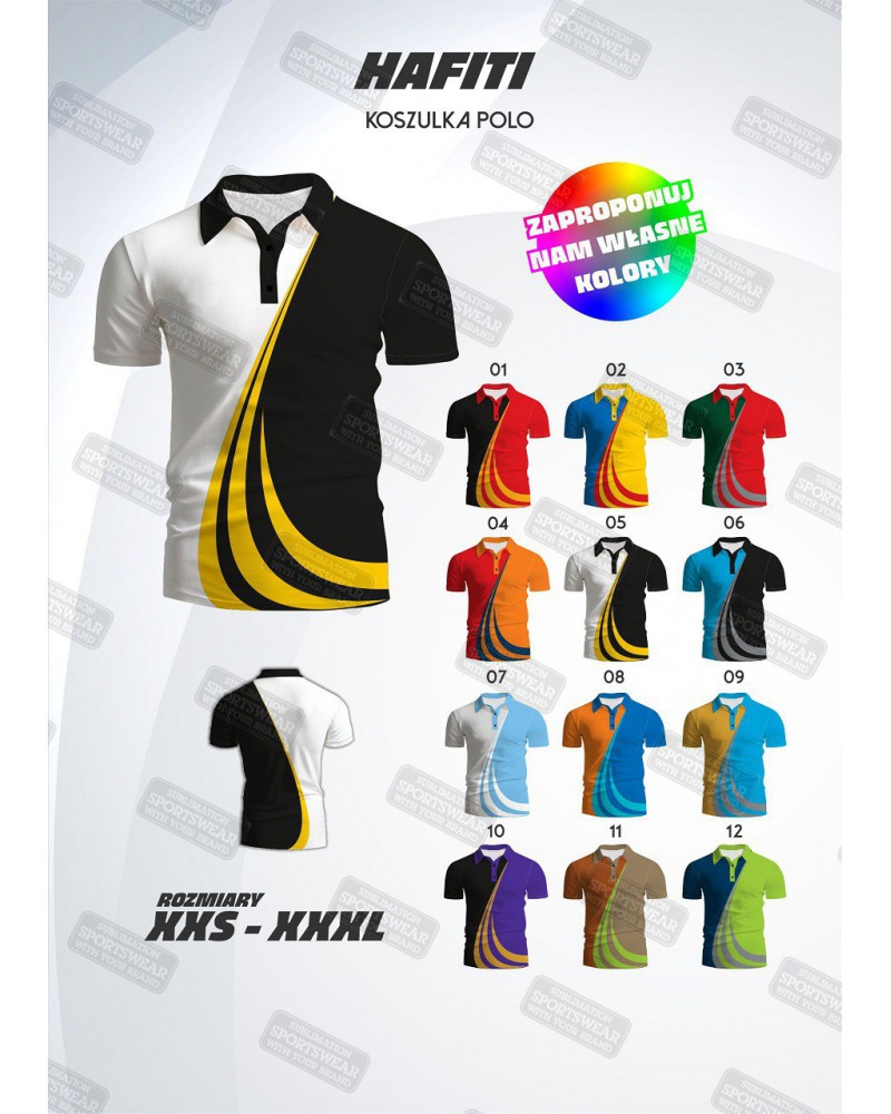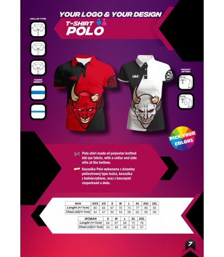 Koszulka polo wykonywana z dzianiny poliestrowej mikro. Krój koszulki luźny. Delikatnie usztywniony kołnierzyk. Zapinana na guziki lub suwak. U dołu dwa boczne rozporki wzmocnione ryglem. Możliwość wykonania koszulki z kieszonką.