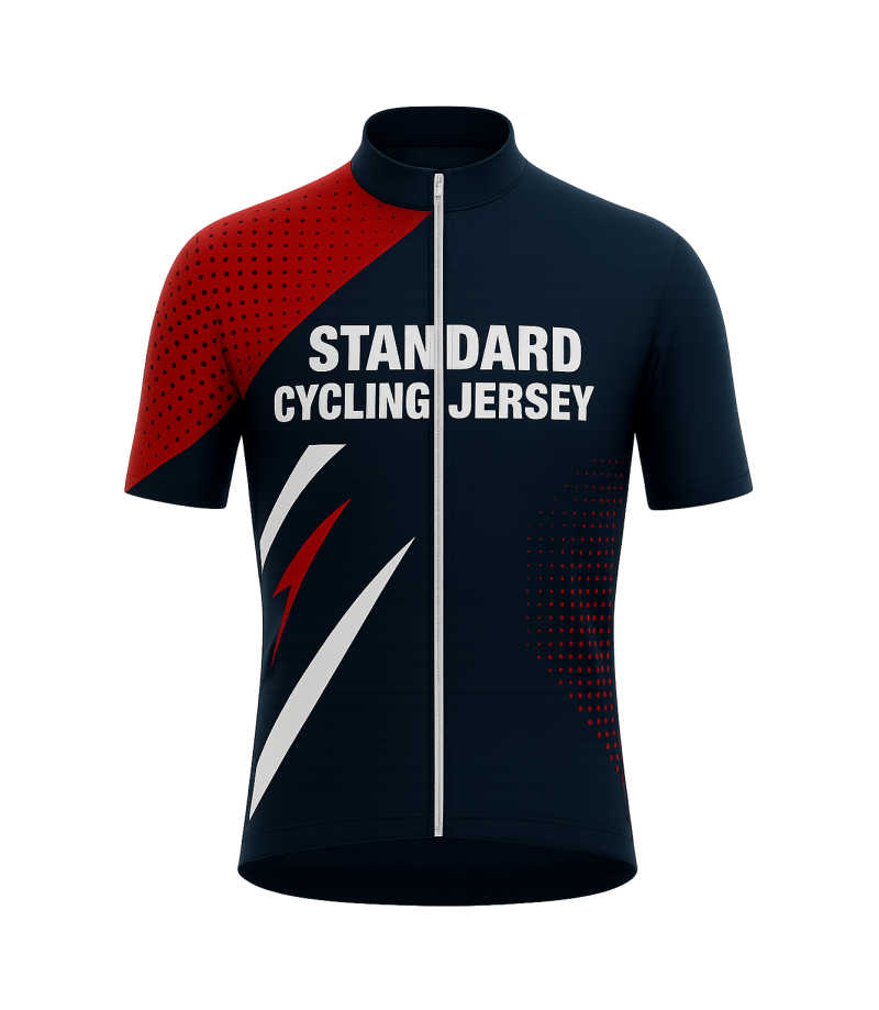 Koszulka kolarska wykonywana z dzianiny poliestrowej z dzianiny poliestrowej Standard. Krój koszulki idealnie dopasowujący się do ciała. Z przodu zapinany na suwak, z tyłu kieszonki. Materiał idealnie odprowadzający wodę na zewnątrz, bardzo komfortowy. Dół koszulki zakończony taśmą silikonową aby zapobiec ściąganiu się koszulki, produkt na zamówienie.