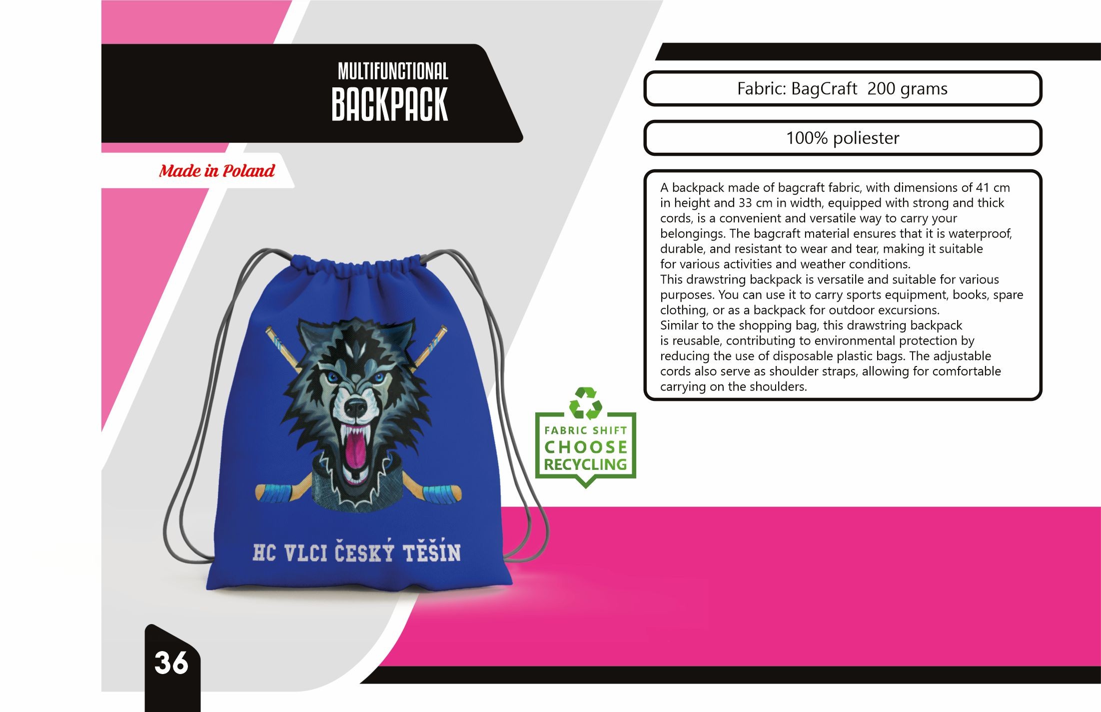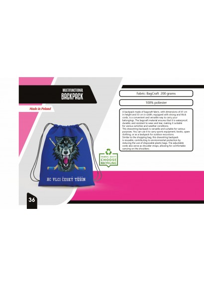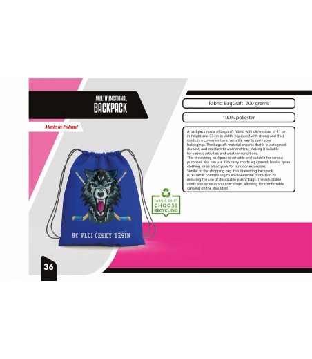 Wielofunkcyjny plecak z możliwością dowolnego zadruku wierzchniej części. Plecak o wymiarach 41x 33cm ściągany sznurkiem